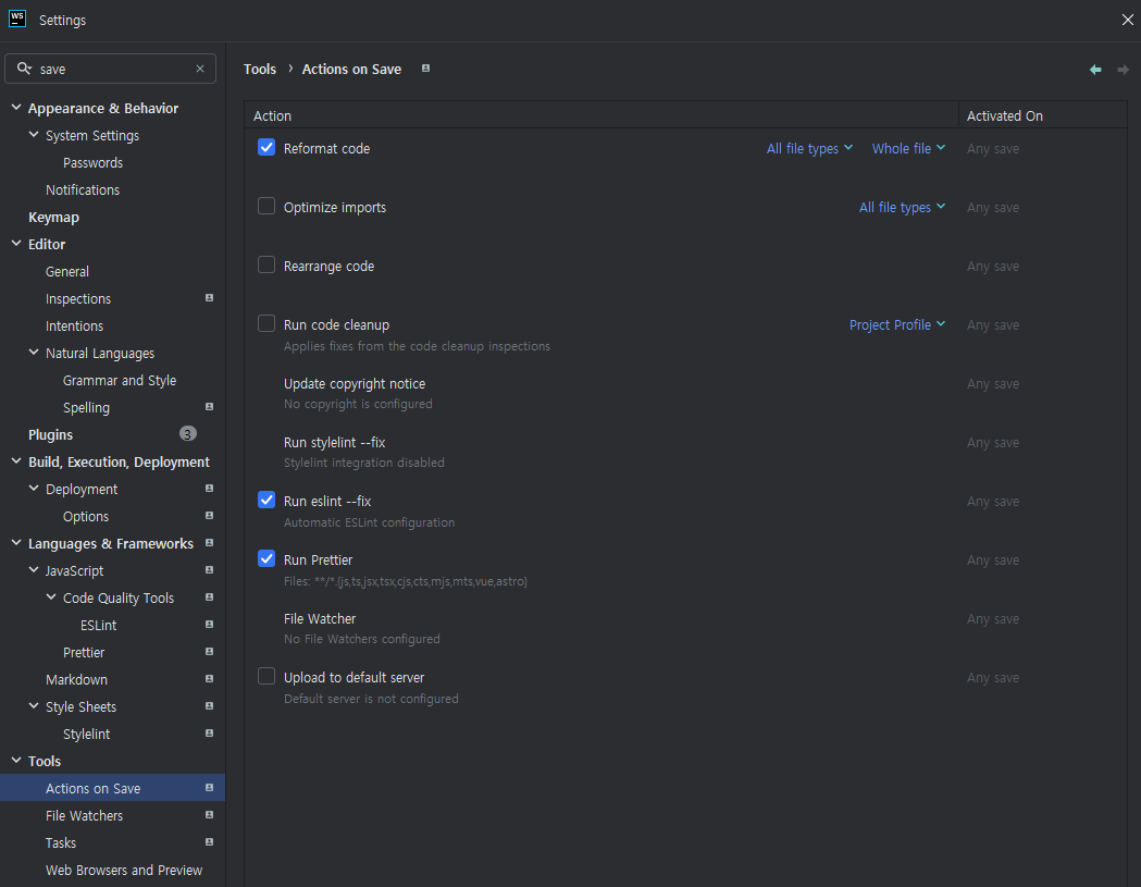 아래처럼 설정해두면 ctrl+s 로 저장 시 자동으로 eslint 코드 적용된다.