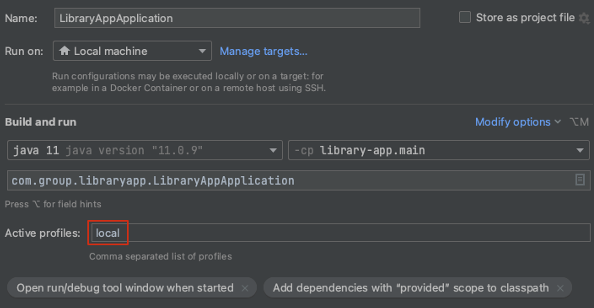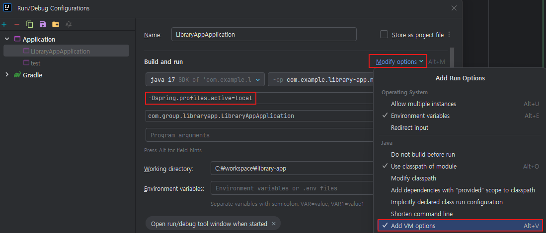 Modify options 클릭 -> Add VM options 클릭 -> Dspring.profiles.active=local 입력