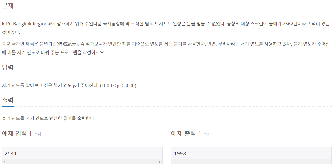 문제 풀이public class Main { public static void main(String[] args) throws IOException { //방법 1 Scanner sc = new Scanner(System.in); int year = sc.nextInt(); System.out.println(year); //방법 2 BufferedReader br = new BufferedReader(new InputStreamReader(System.in)); String s = br.readLine(); int adYear = Integer.parseInt(s); int beYear ..